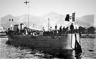 In January 1912 Artigliere, her sister ship Garibaldino, and the protected cruiser Piemonte deployed to the Red Sea to search for Ottoman ships along the coast.[15] On 7 January 1912 Artigliere came across a large group of Ottoman ships – the gunboats Ayintag (or Antep),[23] Bafra,[24] Gökçedağ,[25] Kastamonu,[26] Ordu,[27] and Refahiye,[28] the armed tug Muha, and the armed steam yacht Şipka[29] (formerly Fuad, Fauwette, or Fouvette) — in the harbor at Kunfuda on the coast of the Arabian Peninsula. The Ottoman vessels moved to attack Artigliere, and Garibaldino and Piemonte rushed to her aid. The ensuing clash, the Battle of Kunfuda Bay, lasted for three hours. Opening fire at a range of 4,500 metres (4,900 yd), the Italians sank three of the gunboats and forced the other three to beach themselves to avoid sinking, their crews fleeing after reaching shore. Sources do not mention the fate of Muha. On 8 January, the Italian ships returned and put ashore landing parties which completed the destruction of the beached gunboats after salvaging guns and trophies from them. The ships then bombarded Kunfuda and captured four Arab dhows. After the Ottoman troops in the area fled, a landing party from Piemonte occupied the town. Sources are unclear as to whether Şipka sank or remained afloat during the events of 7–8 January, but agree that the Italians seized her as a prize, towed her to Massawa, and later took her to Italy, where she was incorporated into the Regia Marina as the gunboat Cunfuda.[15][30][31][32]