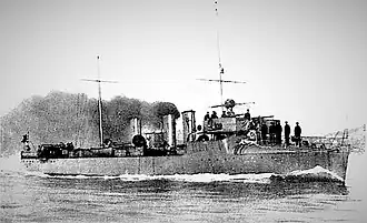 The Italo-Turkish War began on 29 September 1911 with the Kingdom of Italy′s declaration of war on the Ottoman Empire. At the time, Carabiniere was part of the 2nd Squadron's 3rd Destroyer Division along with her sister ships Alpino, Fuciliere, and Pontiere.[2] On the afternoon of 29 September Carabinieri took part in one of the first clashes of the war, the Battle of Preveza, when she, along with Alpino, the destroyers Artigliere and Zeffiro, and the torpedo boat Spica engaged the Ottoman Navy torpedo boats Antalya and Tokad as they attempted to leave the port of Preveza on what then was the Ionian Sea coast of the Ottoman Empire. The Italian ships attacked the two torpedo boats at 14:00, and Artigliere seriously damaged Tokad and pursued her into the anchorage as she attempted to return to Preveza. Meanwhile, Carabiniere, Alpino, Spiga, and Zeffiro surrounded Antalya. Hit repeatedly, seriously damaged, and on fire, with four members of her crew killed in action and numerous other crewmen wounded, Antalya struck her colors and ran herself aground on a nearby beach. As Antalya′s crew abandoned ship, members of Alpino′s crew boarded and captured her and removed her flag and her only usable gun, after which Alpino finished her off with gunfire. Carabiniere, Alpino, Spiga, and Zeffiro then joined Artigliere in the harbor and sank Tokad and an Ottoman gunboat. As the Italian ships departed, the crew of the Greek steamer Marte cheered them.[3][4][5][6][7]