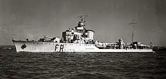 Freccia was involved in several convoy actions in the course of the war.[10] On 21 February 1941, Freccia led the escort of a three Axis merchant ships on their way back from Tripoli, Libya. In the afternoon, the British submarine HMS Regent torpedoed the German freighter Menes, which was hit amidships. Regent endured an intense depth charge attack by the destroyers Turbine and Freccia and received some damage. Menes was eventually towed to safety by the third destroyer of the escort, Freccia's sister ship Saetta.[14][15] On 11 December 1941, Freccia was escorting the transport Calitea when the Italian motor vessel was torpedoed and sunk by the British submarine HMS Talisman. Freccia counter-attacked Talisman with depth charges and rescued 230 survivors.[16] On 28 July 1942, nine Beauforts torpedo bombers from the 39 Sqn departing from Malta launched a sortie against the Italian motor vessel Monviso, escorted by Freccia and the torpedo boat Calliope in a small convoy to Benghasi. The warships and the Axis fighter escort shot down two bombers, but Monviso was badly hit. Freccia towed the merchant ship to Navarino, where she was repaired, only to sink on a minefield some weeks later.[17] On 6 September 1942, while escorting the motor vessels Luciano Manara and Ravello from Taranto to Benghasi along with the destroyers Bombardiere, Fuciliere, Geniere, Corsaro, Camicia Nera and the torpedo boat Pallade the convoy came under torpedo attack from Malta's Beauforts from the 39 Sqn. The Italian ships shot down two Beauforts and two supporting Beaufighters, not before one of the aerial torpedoes struck Luciano Manara's stern. Freccia took the motor vessel in tow, and beached her in Arillas bay, Corfu. Luciano Manara was eventually salvaged and survived the war.[18] On 29 December 1942, Freccia, fitted by then with the radar warning system Metox,[5] was lightly damaged when an aerial torpedo hit and blew up the ship she was escorting to Tunis, the transport Iseo, loaded with ammunition. After rescuing survivors, the destroyer was detached to reinforce the escort of a two-German merchant convoy.[19] While undergoing modernisation works at Genoa, Freccia was bombed and sunk at dock by RAF Lancaster bombers during an area air raid on the city on 8 August 1943. Her hull was eventually refloated and scrapped in 1949.[20]