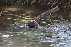 In recognition of the fact that many people use the towpath to exercise their dogs, dog dips have been installed at Allbrook and Shawford. These provide easy access into the water for dogs, and owners are encouraged to only allow dogs to swim at these locations, to conserve the bank in other places.[49] The water vole surveys have followed the best practice described in the Water Vole Conservation Handbook (2006), and have also recorded evidence of otter, brown rat and American mink populations. While carrying out the work, the surveyors have also counted sightings of kingfisher, grey heron, moorhen and coot.[50] A bat survey carried out in 2008 recorded six of the 17 species common to the United Kingdom. Those recorded were common pipistrelle, soprano pipistrelle, Daubenton's, noctule, and serotine and brown long-eared bats.[51] Eel surveys have been carried out on the navigation at two-yearly intervals since 2009. The 2017 survey showed a slight increase in the number of smaller eels detected, but overall the population is still at risk,[52] having declined by around 60 percent since 2009, although there was a small increase since 2015, and the sizes of those measured were more variable, indicating that the population may be recovering.[53] Most of the population is confined to the lower river, below Shawford.[54] The surveys also record the other varieties of fish caught, which include brown trout, Atlantic salmon and grayling in significant numbers, with smaller quantities of gudgeon, roach, perch and pike. Brown trout inhabit most of the river, whereas the other species are mainly found in the lower river.[55]