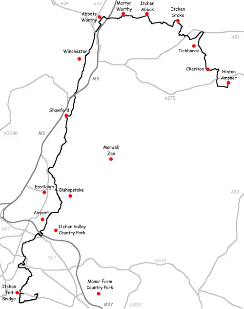 The northern part of the path is within the South Downs National Park and follows the valley of the River Itchen from close to its source at Hinton Ampner.[1] The route passes the springs at the head of the river, before running through New Cheriton, Cheriton. At Tichborne, after touching the edge of New Alresford, the path cuts the corner to Ovington. The river is crossed several times, to Itchen Stoke, Avington and Itchen Abbas. From here the path stays on the right bank to Martyr Worthy.