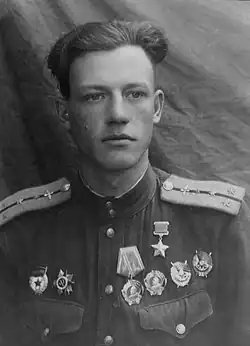 Pavlov continued flight training after the German invasion of the Soviet Union and in May 1942 graduated from the pilots' school with the rank of sergeant.[1] Pavlov fought in World War II with the 6th Guards Assault Aviation Regiment, a ground attack unit, beginning as a pilot and rising to senior pilot, deputy squadron commander, squadron commander and regimental navigator in the course of the war. He fought on the Kalinin Front from June 1942, the 1st Baltic Front from October 1943, and the 3rd Belorussian Front from February 1945 to the end of the war in May. He participated in the Rzhev–Sychyovka offensive, the Rzhev–Vyazma offensive, the Dukhovshchina–Demidov offensive, the Nevel offensive, the Gorodok offensive, the Vitebsk offensive, the Vitebsk–Orsha offensive, the Polotsk offensive, the Šiauliai offensive, the Riga offensive, the Memel offensive, the East Prussian offensive, and the Samland offensive.[1]