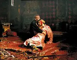 Ivan the Terrible and His Son Ivan on 16 November 1581[a] is a painting by Russian realist artist Ilya Repin made between 1883 and 1885. It depicts the grief-stricken Russian tsar Ivan the Terrible cradling his dying son, the Tsarevich Ivan Ivanovich, shortly after Ivan the Terrible had dealt a fatal blow to his son's head in a fit of anger. The painting portrays the anguish and remorse on the face of the elder Ivan and the shock and heartbreak of the dying Tsarevich, shedding a tear at the unexpected betrayal and shock of having been killed at his father's hands.