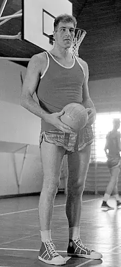 In 1953, Krūmiņš was discovered by head basketball coach Alexander Gomelsky, and he was brought to the basketball club Rīgas ASK.[2][3] Gomelsky was struggling to make ASK the top Latvian basketball club of the time, and he needed a strong player at the center position. Although Krūmiņš had never played basketball before, Gomelsky intuitively believed in his potential, and spent up to 2 hours personally training Krūmiņš before each of the team's training sessions. Gomelsky considered Krūmiņš to be his only apprentice in his whole basketball career — all the other players that he coached were well-established before he had coached them. Physically, Krūmiņš had good coordination and extraordinary strength, but he was slow. His height was exceptional for that time, and was variably reported between 2.18 and 2.23 m (7 ft 2 in and 7 ft 4 in).[4][5] The variation was mostly due to his body's natural contraction during the day, and over the length of his playing career.[2] With a weight of 141 kg[4] (312 pounds), he was described as, "well built and dry". He was not a talented pupil, but he was exceptionally persistent, and performed all the drills that were set by his coach. His strongest point, according to Gomelsky, was his mental balance and reliability. On the other hand, he was too shy for a team leader. Seeing a 2.20 m (7 ft 3 in) giant, most defenders did not hesitate to step on his toes, or to push or punch him. Krūmiņš patiently took all abuses, and when once asked why he didn't fight back, replied that he was afraid he might accidentally kill someone. Later, when Krūmiņš became a star, his modesty brought another problem — he was instantly recognized by people on the streets, and cheered and touched by the crowds, which made him feel uncomfortable. As a result of that, he stopped using public transportation, and drove a car instead.[2][3]