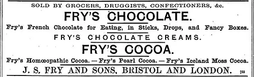 J. S. Fry & Sons, Ltd., better known as Fry's, was a British chocolate company owned by Joseph Storrs Fry and his family. Beginning in Bristol in 1761, the business went through several changes of name and ownership, becoming J. S. Fry & Sons in 1822. In 1847, Fry's produced what is often considered the first solid chocolate bar. The company also created the first filled chocolate sweet, Cream Sticks, in 1853.[1] Fry is most famous for Fry's Chocolate Cream, the first mass-produced chocolate bar, which was launched in 1866, and Fry's Turkish Delight, launched in 1914.[1]