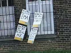 About 1,500 people gathered for a rally, picketing, speeches, a march and a political sing-song in the centre of Sheffield. A series of trades union speakers addressed the rallying crowd of teachers, civil servants and students outside Sheffield City Hall.[10] There were protests at a few schools in the Sheffield area by students against the teacher's strikes, with several almost descending into violence. There were also small protests at Gleadless Townend (which caused disruption to bus services and car traffic as they blocked roads, but let trams through), at nearby Manor Top, and near Spring Lane tram stop.