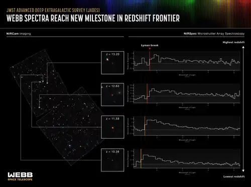 JADES-GS-z13-0 is a high-redshift Lyman-break galaxy discovered by the James Webb Space Telescope (JWST) during NIRCam imaging for the JWST Advanced Deep Extragalactic Survey (JADES) on 29 September 2022. Spectroscopic observations by JWST's NIRSpec instrument in October 2022 confirmed the galaxy's redshift of z = 13.2 to a high accuracy, establishing it as the oldest and most distant spectroscopically-confirmed galaxy at the time, with a light-travel distance (lookback time) of 13.4 billion years.[4][3] Because of the expansion of the universe, its present proper distance is approximately 33 billion light-years.[5] In 2024, two older and more distant galaxies, JADES-GS-z14-0 and JADES-GS-z14-1, were found.[6]