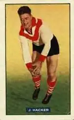 Hacker, a defender who could play in the ruck, was recruited by South Melbourne from Oaklands in New South Wales.[3][4] He won South Melbourne's "most improved player" award in 1938 and went on to play 111 league games for the club.[5][6] This included two finals in 1942, a semi final win over Footscray and preliminary final loss to Essendon.[7][8] A knee injury kept him on the sidelines in 1945 and he also wasn't able to play senior football the following year.[9][10]