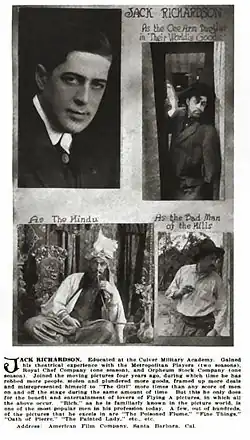 In 1911, Richardson travelled with the American Company to film westerns under the company's Flying A banner. Richardson was among a troupe of actors who were based at La Mesa who would produce an average of two western films a week. There, Richardson was regularly as a "heavy" or in villain roles.[1] Flying A left La Mesa in 1912,[1] but Richardson would continue to be cast as a villain in cowboy roles, such as "Scarface Jordan", in the 1925 feature Ridin' Wild.[2]
