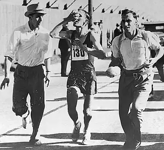 ![]() Gibson (center) running marathon at the 1938 British Empire Games | ||||||||||||