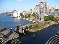 Jacksons Landing with the old Glebe Island Bridge in foreground, viewed from Anzac Bridge