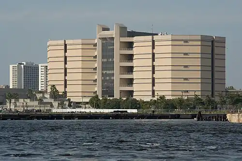 On February 18, 1974 ground was broken for the Police Administration Building at 501 East Bay Street. It was later renamed Police Memorial Building (PMB). The adjacent jail was constructed in 1990.[20] In 2024 JSO stated that the fifty-year old building was inadequate for the agency's needs.[21] The PMB provided just 215 parking spaces for 739 employees, requiring lease of a grass lot across the street. Total PMB office space was 165,466 sq ft (15,372.3 m2) which forced 184 JSO employees to work in off-site office space.[22] In 2025 JSO was facing a $6 million bill for work on the PMB including replacing flooring, air handling units and work on the helicopter landing pad on the rooftop. The fueling station was the only police function destined to remain at East Bay Street.[22]