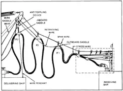 - Support and guidance for transfer of personnel and materials between vessels at sea (underway replenishment), suspended from a traveller block and controlled by lines running in both directions.[1]
