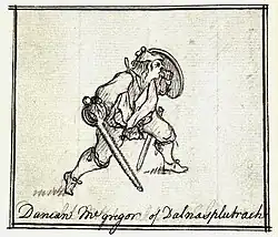 With the exception of the strongly Presbyterian south-west, the Jacobites also recruited outside the Highlands, although inevitably some were coerced.[26] Jacobite leaders Lord George Murray, the Duke of Perth and Tullibardine had close links to Perthshire, which supplied around 20% of total recruits.[27] Another 24% came from the north-east, where John Gordon of Glenbucket was one of the first to join the Rising; support was focused around Auchmedden, Pitsligo and Fyvie, areas Royalist and Episcopalian since the 1639 Bishops War.[28]