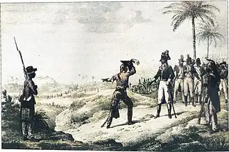 Before the arrival of Leclerc, Louverture had ordered Maurepas to make the most vigorous resistance to all vessels which should appear before Port-de-Paix, and, in case he was not strong enough (having only half of a brigade), burn the city to the ground and afterward withdraw to the mountain, take with him ammunition of all kinds; there to defend himself to the death. [2] On February 12, 1802, suspecting the French expedition was about to land in the city, Maurepas burned the city down and retreated to a nearby mountain named Les Trois Pavillons. When French General Humbert arrived, he saw the city in flames. [3][4] On February 13, Humbert marched against Maurepas, but was completely defeated. When Charles Leclerc heard this terrible news, he sent by sea General Debelle against Maurepas, who defeated Debelle's army. However, Maurepas, instead of continuing to fight, surrendered to the French.[5]
