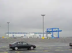 JadeWeserPort (German pronunciation: [jaːdə veːzɐ pɔɐ̯t]) is Germany's largest harbour project. It is supported by the states of Lower Saxony (50.1% stake) and Bremen (49.9% stake).[2] This new container port is located at Wilhelmshaven at the Jade Bight, a bay on the North Sea coast. It has a natural water depth in excess of 18 m. Container ships with a length of 430 metres (1,410 ft) and 16.5 metres (54 ft) draught are able to call the JadeWeserPort at any tide. Construction work was begun in March 2008. The port was opened on 21 September 2012.[3] However, due to the Great Recession, the port wasn't given the warmest of welcomes, and very little TEU traffic flowed through the brand new harbour.[4] But the container handling could be raised from 60,000 in 2014 to 712.953 twenty-foot equivalent unit in 2021.[5] The yearly capacity of the port is 2,700,000 TEU.[6][7][8][9][10][11]