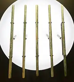 A set of five jade tubes, with the length of 29 cm, were unearthed in the Peinan Site and are now collected in the National Museum of Prehistory. They can be dated back to 2,800 to 2,300 years ago (2,800–2,300 B.P.; or 850–350 BC) and came from the slate coffins. The five tubes were in a bundle and placed by the tomb’s owner. This set of jade tubes is polished well and in the same specification. Compared with other jade ornaments of the same type unearthed in other archaeological sites in eastern Taiwan and nearby countries, this set of jade tubes is the longest one, displaying the masterfulness and world-class uniqueness of the jade craftsmanship in Neolithic Taiwan. It was designated as a national treasure by the Ministry of Culture in 2012.[2]