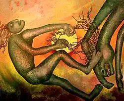 The political turmoil from the late 1960s to the early 1970s, including the rise of the leftist movement in the fold of CPI(ML) and the Bangladesh liberation war of 1971, affected creative persons and influenced Dasgupta's creative expression. In this early phase, his paintings often revealed reality in its crudest form, such as an acrylic canvas of 1994 titled 'Scrap' which shows clusters of dilapidated human bodies tied together on a crate being pulled up by a crane.