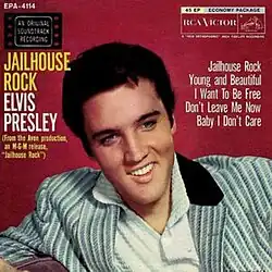 Jailhouse Rock is an EP by American singer Elvis Presley, featuring songs from the movie of the same name. It was released by RCA Victor, with catalogue EPA 4114, on October 30, 1957. Recording sessions took place at Radio Recorders in Hollywood on April 30 and May 3, 1957, with an additional session at the Metro-Goldwyn-Mayer Soundstage in Hollywood on May 9 for "Don't Leave Me Now".[2] It peaked at #1 on the newly inaugurated Billboard EP chart where it remained at #1 for 28 weeks. The EP album was the best selling EP album of 1958 according to Billboard.[3]
