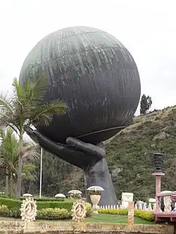 The park contains replicas of the Taj Mahal in India, as well as replicas of the Seven Wonders of the Ancient World.[4] It also has several monuments, including a large hand holding a globe, which is the emblem of the park, meant to represent the hand of God. Inside the replica of Taj Mahal, there are reproductions painted in ceramic of great works of world art and the Cyclorama of Colombian Independence (in Spanish: Ciclorama de la Independencia Colombiana), a 165-meter-long and 7-meter-high mural that represents the entire process of that country's independence since the Revolution of the Comuneros in 1781, the Cry of Independence and the Battles of the Vargas Swamp and the Boyacá Bridge in 1819.[5][6][7]