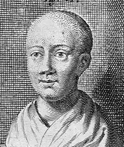 Early during his tenure as Regent the first Europeans entered Lhasa: the Jesuits Albert d'Orville and Johannes Grueber arrived there in 1661 and referred to Jaisang Depa as the "King" and "the brother of God the Father [Lobzang Gyatso]," who treated them kindly. The Jesuits stayed two months and Grueber reported that the king, with the title of Deva [Depa], was descended from an ancient race of Tangut Tatars and resided at the Butala [Potala], a castle on a hill, as in Europe, with a numerous court; it was he, wrote Grueber, who carried on the government.[1] Grueber also sketched what he saw and his efforts were later converted into plates in Kircher's China Illustrata, published in Amsterdam in 1667. These included a life drawing of Jaisang 'Deva', made at his own request, in which he appears shaven-headed and in monk's robes (see thumbnail image, top right).[36]