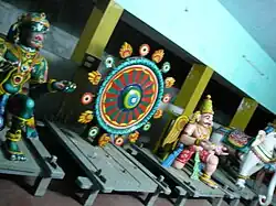 As per Hindu legend, King Ambarisha who immersed himself in the worship of Vishnu, failed to strengthen his army and lost his kingdom. While doing worship, he also did not observe the sage Durvasa who went along his way. The sage got irritated and cursed the king. The king went to Vishnu for rescue, who sent his discus to chase the sage. The sage surrendered to Vishnu and begged pardon. The king Ambarishan is believed to have built the temple and hence the presiding deity is also called Ambarisha Varadhar at this place.[2]