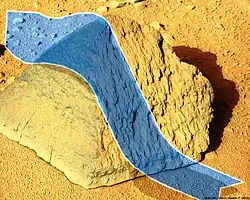 Analytical studies, performed on the rock by the Curiosity rover in October 2012, suggest the Jake M rock is an igneous rock but found to be high in elements consistent with feldspar, such as sodium, aluminum and potassium, and lower concentrations of magnesium, iron and nickel than other such rocks previously found on Mars.[4] The mineral content and elemental abundance indicates Jake M rock may be a mugearite, a sodium rich oligoclase-bearing basaltic trachyandesite.[5] Igneous rocks similar to the Jake M rock are well known but occur rarely on Earth. On Earth, such rocks form when magma, usually found in volcanoes, rises to the surface, cools and partially solidifies with certain chemical elements, while the warmer liquid magma portion becomes enriched with the left-behind elements.[4] By remarkable coincidence, the Martian locality Glenelg is also the name of a small settlement in north-west Scotland that is 25 km (16 mi) east of type locality for mugearite at Mugeary on the island of Skye.[5] The Jake M rock is a ventifact with a volcanic fabric.[6] Its pyramidal shape was formed by eolian drifted grains of sand. The little cavities on its surface were formed by the blast-effect, which is caused by different flow dynamics at the micro-relief.[6] On the surface one could see the marks of the main wind direction, by which Jake M was formed.[6] On September 27, 2013, NASA scientists reported that Jake M rock was a mugearite and very similar to terrestrial mugearite rocks.[7][8][9][10]