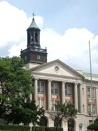 The current Jamaica High School campus opened in 1927,[2] and is located on a large tract between 168th Street to the east and Chapin Partway to the west in the Jamaica Hills section of Jamaica, across from Captain Tilly Park.[4] The school faces towards Gothic Drive at the south end of the campus. 84th Avenue marks the north end of the site, one block south of the Grand Central Parkway.[2][5][6] The property is 13 acres (5.3 ha) in size.[7][8] This large expansive campus is unconventional for a New York City school.[2] Across 84th Avenue is Thomas A. Edison High School, a vocational school. Across to the south and west is Captain Tilly Park.[2][5][6] The campus occupies a hilltop location with commanding views on Gothic Drive.[9] When the building first opened, views were available across to the bodies of water surrounding Long Island: the Long Island Sound, East River, and Atlantic Ocean.[10] A large lawn separates the school building from Gothic Drive, with a stone stairway and pathway leading up from the street to the school.[2][11][12] An iron fence encircles the entire property.[2]