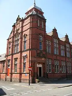 Several of Prestwich's buildings survive including the Central Buildings on Bradshawgate which were built for the Leigh Friendly Co-operative Society, Leigh Cenotaph,[4] Leigh Technical School and Library on Railway Road, Leigh Town Hall, Leigh Infirmary, and numerous shops, public houses, business premises, and houses in Pennington. Other buildings have been demolished including Leigh Public Baths and Leigh Union workhouse hospital. Prestwich designed other public buildings including Tyldesley Library and Atherton Town Hall. Further afield, he designed public baths in Ashton-in-Makerfield, Northampton, and Stockport, as well as schools in Atherton, Southport, Birkdale, and Hindley.[1][5]
