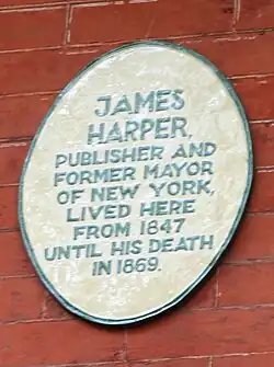 Harper lived at 50 Rose Street while he was mayor and later at No. 4 Gramercy Park West from 1847 until he died in 1869. The Gramercy Park house was built in the Greek Revival style and was designed by architect Alexander Jackson Davis.
