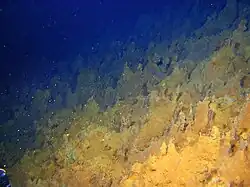 Hydrothermal venting occurs on the southern floor of Healy Caldera[11] and produces metal-rich discharges[59] and iron oxide mounds.[60] There is no evidence for hydrothermal activity at Cotton,[61] and unlike all other Kermadec arc volcanoes, there are no known chemosynthetic animal communities at Healy.[62]