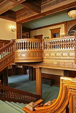 Stained woodwork is featured broadly throughout the house. Hand-carving, finely detailed but restrained in ornament, is found in the central hallway, the music room, and the formal dining room, which also has gold leaf plate on its ceiling. Other rooms in the house, particularly on the second floor where most of the family members lived, simply have richly colored and nicely detailed woodwork.