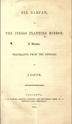 In 1861, at the height of the Indigo revolt by the ryots in Bengal, Long received a copy of the Bengali play Nil Darpan (also transcribed as Neel Darpan or Nil Durpan) from its author Dinabandhu Mitra, who had been one of Long's students at the CMS school on Amherst Street. The play, published anonymously the previous year in Dacca, was sympathetic to the abject condition of the ryots or labourers on indigo plantations and critical of European planters for their treatment of indigo cultivators.[7] Long brought it to the notice of Walter Scott Seton-Karr, Secretary to the Governor of Bengal and ex-President of the Indigo Commission. Seton-Karr, sensing its importance, mentioned Nil Durpan in conversation with the Lieutenant Governor, John Peter Grant. Grant then expressed a wish to see a translation of it and print a few copies to be circulated privately amongst friends. Long had it anonymously translated into English "By A Native" (Long refused to divulge the name of the translator to the trial court; Bankim Chandra Chattopadhyay later attributed the translation to Michael Madhusudan Dutt, although this attribution remains contentious[8]) and printed in either April or May 1861.[9] In his introduction to the play, he wrote that "[i]t is the earnest wish of the writer of these lines that harmony may be speedily established between the Planter and the Ryot..."[10] Long sent the translated manuscript to Clement Henry Manuel, the proprietor of the Calcutta Printing and Publishing Press, to print five hundred copies at the cost of some three hundred rupees. Unknown to the Lieutenant Governor, Long began sending out copies in official Government envelopes to prominent Europeans both in India and abroad that had the heading: "on her Majesty’s Service."[11]