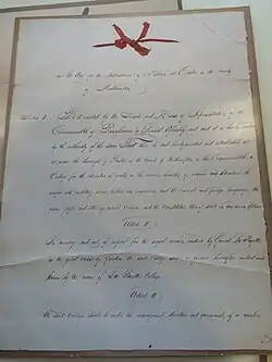 The newspaper, The Centinal, printed an advertisement calling for Easton citizens to attend a meeting on December 27, 1824, at the Easton Hotel to discuss the potential for building a college. At the meeting, led by Porter, the assembly discussed the ability for a college to thrive in Easton, saying that, "It was emphasized that the academy, which had undertaken only secondary education, had failed because it was dependent purely on local patronage and was subject to all the whims and prejudices of the neighborhood, whereas an institution of higher learning would attract students from a wide area and would therefore be independent of these local factors".[13] Porter emphasized the importance of teaching military science to prepare young men for war and inspire leadership. He also stressed the importance of teaching the German language because of the heritage of the majority of the population in Easton. Soon after, Porter, along with assembly members Joel Jones and Jacob Wagener, drafted a charter for the college to be sent for legislative approval.