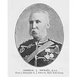 Michael was the son of Colonel James Michael.[2] He became a second Lieutenant in the Madras Staff Corps in 1844, becoming a Lieutenant in 1847, Captain in 1856 with the 39th Native Infantry, Major in 1864 and Lt. Col. in 1870. He was promoted Colonel on 10 December 1875 and on 7 March 1876 he was made Companion of the Order of the Star of India.[3] He later wrote on the history of the Madras Army.[4][5]