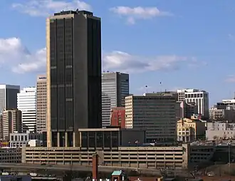 The James Monroe Building is an office building located in Downtown Richmond, Virginia. It is the tallest building in Richmond at 137 meters (449 ft) and 29 floors. Only 25 of the floors, however, are actually occupiable as the top and middle two are maintenance floors.[2] Although it is the tallest building in Richmond, its location at the bottom of a hill gives it the appearance of being roughly the same height as other buildings in the Richmond skyline. The building has a parking garage at its base and is located adjacent to Interstate 95.