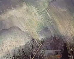 In 1911, he achieved a feat that was out of reach for most beginning artists when Louis Katz gave him a solo exhibition at his eponymous commercial art gallery on West 74th Street in Manhattan.[note 6] An equally unlikely outcome was a long and appreciative review of this exhibition in the Brooklyn Daily Eagle. Crediting Rosenberg with a "poetic sense," the paper's critic said the 40 pastels in the show were "sensitive and quietly impressive rather than bold and big in style, color," and added, "the subtle handling of themes are important points in the work." This critic went on to give favorable appraisals of many works by name, writing, for example, that "'Jamaica Bay, Emerald and Mauve,' shows a remarkable scenic effect, with its green-shot water and mauve areas. There are some evening effects with lights of big hotels along the shore, piercing the remembrance of sunset in the sky."[62] A critic for the New York Times was also impressed by the show, saying the pastels were "refined in color and show[ed] a vision sensitive to beauty." Of two of them, this critic wrote, "'Wet Street,' is a poetic transcription of a scene many times noted by the artists of the city, and 'Steam and Mist' is another successful version of the mysterious and exquisite effects with which New York clothes her medley of architecture."[66] In 1913, Rosenberg received a second solo exhibition of pastels, this time at the Arlington Art Galleries in Brooklyn, and, once again, the works displayed received favorable critical notice.[note 7] One critic praised a "refinement and practiced hand" and another said the pictures had "refined color and much feeling for nature."[68][69] A third critic was almost effusive, writing, "Many men aim at poetry through the medium of pictorial art, but it is not often they achieve the lyric bays so truly as this painter has done in this little group of pastels."[70][note 8] In 1916, he contributed a painting to the annual exhibition of the New York Water Color Club.[71] In 1917, he exhibited in the first group exhibition held by the Society of Independent Artists. The following year he showed pastels at the Anderson Galleries with all proceeds from sales to be donated to the Red Cross.[note 9] The show included landscapes and still lifes. A critic for the New York Tribune praised one of the former, "Scattering Clouds," as a "strong piece of work" revealing "deep blue mountains" against an "exquisite turquoise sky."[73] In 1921, he showed with Marsden Hartley at the Anderson Galleries.[63] The following year Rosenberg helped found a gallery called The New Gallery (and was called one of the gallery's "leading spirits and godfather").[8][74] The gallery was financed in part by an innovative scheme, the New Gallery Club, begun in February 1923. The club supported the gallery through its membership fees and it raised funds and publicized exhibitions by means of entertainments, teas, and receptions. Many club members were amateur artists whose work the gallery showed in special exhibitions.[75] In 1924, Rosenberg showed three paintings in a group exhibition at the gallery.[74] Four years later, he held a solo exhibition of Adirondack Mountain landscapes at the Erich Galleries.[64][note 10] At that time he told an interviewer that he painted simply for the joy of it. He said, "I have no suppressed longing to live in the South Seas and do nothing but paint. And I have no 'message' to give the world. I happen to be very fond of the Adirondacks, and my summer home is located among them."[64] His painting, "Adirondack Cloudburst," of 1946 (shown at right) is one of many mountain landscapes he made in the course of his career. In 1928, he contributed two paintings to a group exhibition of the Salons of America at the Anderson Galleries.[78][note 11] In 1929, Rosenberg departed from the style of painting and subject matter of his earlier work when he produced what turned out to be his best-known piece, a lithograph called "Dies Irae" (Day of Wrath), showing the October 29, 1929, Wall Street Crash as a horrific scene of destruction. On January 12, 1930, the New York Times put a reproduction of the lithograph on the front page of its Sunday magazine.[80] "Dies Irae" is shown at left.