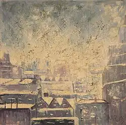 Rosenberg's art is representational. Called a "romantic realist," he adopted Paul Cézanne as his model and explicitly rejected the New York art world's shift toward abstraction in the late 1940s.[94] In a 1959 interview he acknowledged that his style was no longer fashionable and said he was content to serve the needs of his art in his own way. More than that, he disdained the "contemporary avalanches of abstract paintings" and said abstract artists had "nothing new to communicate."[93] He made pastels and oils throughout his career. Beginning in the 1920s he made lithographs and late in his career he made at least one montage. He made landscapes, particularly of scenes from the Adirondack Mountains, where he owned extensive property, but also of scenes from places where he traveled on vacation or business. These paintings were said to show a strong feeling for the natural environment and were seen as refined rather than exuberant.[68][93] He made cityscapes. One example of the latter is an oil called "New York in Snow," shown at right. And he chose current events as his subjects. These include celebrations, such as an early pastel, "Victory Parade—Return of the 27th Division, AEF, 1919" and a late pastel, "March Parade of Colonel John B. Glenn (New York City, March 1, 1962)," but they also include the prints he made showing tragic events, both real (such as the 1929 stock market crash) and imaginary such as the devastation that would be caused by atomic warfare).[88] He preferred to paint in a studio using sketches made outdoors. "I see too much when I try to paint from the subject itself," he once said.[94]