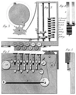 Among the machines featured in the book is an early key-driven adding machine. It is unknown if a prototype of the design was ever constructed, but it would have predated the earliest known key-driven mechanical calculators (an 1834 design by Luigi Torchi) by over a decade. The device features a sliding wheel, used as a floating-point mechanism that can be manipulated to store powers of ten. Special wheels could be swapped in to add in other bases and units, such as one designed for adding £sd.[11]