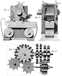 In 1806, he invented what he described as a "horizontal waterwheel"; this would later be classified as an out-flow radial turbine, predating a similar turbine by Benoît Fourneyron in the late 1820s. It is unknown if the two turbines are connected. In 1808, he patented two forms of helical gears, featuring teeth slanted at a 15° angle. This was described by a later biographer as "perhaps the invention on which he placed most store".[7] During the early 1810s, he took out a number of additional industrial patents in France, but was prevented from filing patents in Britain due to the outbreak of the Napoleonic Wars. These inventions include an automatic nail-making machine (the first known device to produce wire nails) and shears for cutting circular portions out of sheet iron.[8]