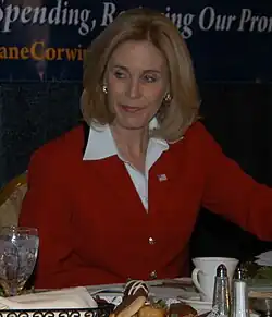 Corwin has said she entered politics in 2008 because she "could not stand idly by and watch state government spend away our children's future."[11] During her first campaign for the Assembly, she said the State needed to adopt a business-like approach, cut spending, cut taxes, end "unfunded mandates" and improve the business environment.[3] She won the primary for the 142nd Assembly District seat[12] against three other Republican candidates including incumbent Assemblyman Mike Cole, who had the Republican party endorsement, but who had been censured for fraternizing with an intern one year earlier.[13][14] Corwin went on to defeat Working Families Party candidate Jeffrey Bono in the November 2008 general election, receiving 89 percent of the vote.[15][16] She ran uncontested in the November 2010 general election, receiving endorsements from the Conservative and Independence parties of New York State.[15]
