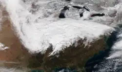 ![]() Satellite image of the blizzard at peak intensity at 14:45 UTC (9:45 a.m. EST) on January 27, 2015 | |