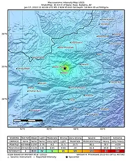 An earthquake measuring Mw 4.9, followed by a 5.3 Mw mainshock struck Badghis Province, Afghanistan, on January 17, 2022. The earthquake led to a large number of casualties for the tremor's magnitude, with 30 dead and 49 injured.[2][3][4][5][6][7] The earthquake destroyed hundreds of homes in northwestern Afghanistan.[5][3]