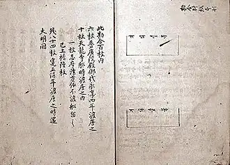 The second mission, headed by Kenchū Keimitsu, set off for China in 1403; when it returned the following year, it did so with an envoy from the Ming and 100 Yongle tallies: "this marks the beginning of the 'tally trade'" (勘合貿易, kangō bōeki),[5] the 1404 mission the first to implement this system.[1][5] While the Ming government would make official purchases, the Japanese envoys and accompanying merchants were permitted to conduct private trade with licensed counterparts. Ningbo was their assigned "port of entry".[3][6] For nearly one hundred and fifty years, until the last such mission in 1547, Chinese "gifts", such as silk thread, brocades, medicines, books, and ceramics, were provided in return for Japanese "tribute", such as lacquerware, bronze vessels, swords, armour, fans, screens, and sulphur (used in papermaking).[1][6][7]
