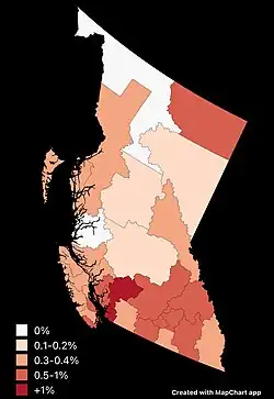 ![]() Population distribution of Japanese Canadians in British Columbia by census division, 2021 census |