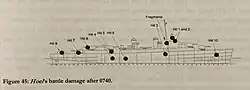 With four salvos, Haguro hit Hoel with nine 8-inch (203 mm) shells and one 5-inch (127 mm) shell, destroying three of Hoel's five 5-inch (127 mm) guns, her port engine, after generator, bridge, and main battery director, as well as inflicting other damage. Had Haguro correctly identified Hoel as a destroyer and not a cruiser, the hits to the turrets and handing room would have likely detonated her magazines and sank her then and there. However, Haguro fired armor piercing shells that penetrated Hoel's unarmored hull without exploding. Still, the damage was significant, and the crippled Hoel was later finished off by gunfire from Yamato and Nagato.[20][21]