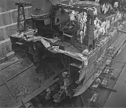 The horrifically crippled, but still afloat Shiranui was left dead in the water unable to move without emergency repairs, but luckily, she was located by the destroyer Naganami, which towed her to Kiska Harbor, while the destroyer Ikazuchi did the same to Kasumi. Because of this, the 18th destroyer division was disbanded, and Kagerō was reassigned to the 15th destroyer division. After temporary repairs, Shiranui was further towed to the Maizuru naval arsenal, where she was immediately drydocked for some much needed repairs. On 17 September, the extreme damage was heavily photographed by Japanese navy officials. The damage was so extensive, that Shiranui remained under repairs until 15 November 1943, well over a year after she had been torpedoed. During these repairs, her "X"-turret was replaced by two additional triple Type 96 25mm AA guns.[2][3]