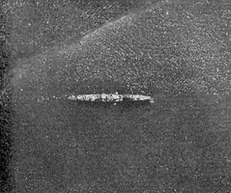 The ship was moderately damaged by an American bomb on 15 December, and she sailed to Occupied Hong Kong for repairs. Ume arrived in Takao, Japanese Taiwan, on 20 January 1945. Ten days later, the ship led her sister Kaede and the destroyer Shiokaze on a mission to evacuate stranded aircrew from Aparri, Philippines.[9] The next day a dozen North American B-25 Mitchells from the 822d Bombardment Squadron attacked the ships 20 miles (32 km) south of Taiwan, sinking Ume as well as damaging Kaede and Shiokaze. The latter ship rescued the survivors, but 77 men were killed and 36 wounded.[9][12]