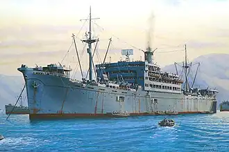 On 9 January 1944 Nigitsu Maru left Palau for Ujina in convoy FU-901 as the sole merchant ship escorted by the destroyer Amagiri. She carried about 2,000 troops, mainly soldiers of the 12th Independent Engineer Regiment. Three days later off the Okino-Daito Island, southeast of Okinawa, Nigitsu Maru was attacked by the US submarine Hake which fired four torpedoes from the surface. Two hit Nigitsu Maru which sank in eight minutes at 23°15′N 132°51′E / 23.250°N 132.850°E. 456 soldiers, 83 gunners and 35 crewmen were killed. Amagiri picked up the survivors and landed them in Japan.[2]