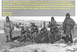 Special Japanese military units conducted experiments on civilians and POWs in China. The purpose of experimentation was to develop biological weapons that could be used for aggression. Biological agents and gases developed from these experiments were used against the Chinese Army and civilian population.[13] These included Unit 731 under Shirō Ishii. Victims were subjected to experiments including but not limited to vivisection, amputations without anesthesia, testing of biological weapons, horse blood transfusions, and injection of animal blood into their corpses.[109] Anesthesia was not used because it was believed that anesthetics would adversely affect the results of the experiments.[110]